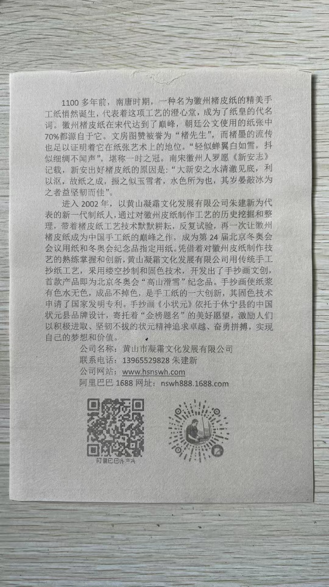 2020年公司實現(xiàn)了文化類規(guī)上企業(yè),迄今已申請了15項發(fā)明專利,19項實用新型專利,其中已授權(quán)發(fā)明專利3項,實用新型專利11項;2022年,公司為北京第24屆冬季奧運會提供楮皮紙和紀念品,非遺傳承人朱建新被授予北京2022年冬季奧會參與證書,以感謝第24屆冬奧會取得圓滿成功做出的貢獻。2022年-2024年,朱建新被中國科技大學(xué)聘為《中國筆墨紙硯》全校公選課特聘導(dǎo)師;2023年,朱建新獲省級非遺傳承人稱號、“黃山工匠”稱號。